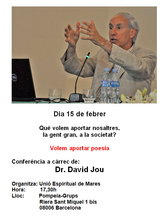 El 15 de febrer, la conferència mensual de la Unió Espiritual de Mares fou impartida pel físic i poeta David Jou, sobre el tema “Volem aportar poesia”. Seguint un dels seus poemes, va caracteritzar la poesia com: “L’aventura de la vida, l’huracà de les idees,/la música de les paraules/ i allò, sobretot allò, que ens és donat”. Així, va destacar el paper de la poesia com a aventura personal de qui l’escriu o de qui, en llegir-la, la fa seva; com a font d’exploració intel·lectual; i com a conreu dels aspectes verbals i musicals de la llengua, a més d’una presència misteriosa que arriba com un do i habita una estona en nosaltres.