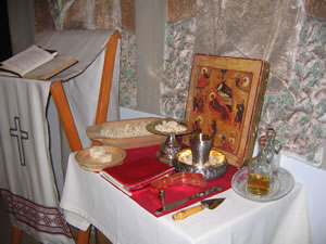 En las fotos siguientes podrán ver parte de ese “ritual”, que comenzando con muchas y largas oraciones previas, se preparan los panes, el vino, el incienso y todo aquello que será utilizado a lo largo del Servicio Religioso.