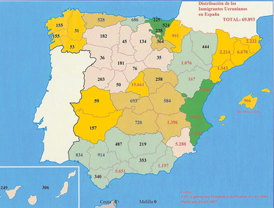 Y gráficamente en el mapa, podemos apreciar la presencia de ucranianos, de modo particular en Madrid, en la Comunidad Valenciana y en Catalunya; mereciendo una mención especial la región de Murcia, donde en relación a la población local la concentración de ucranianos es mayor.